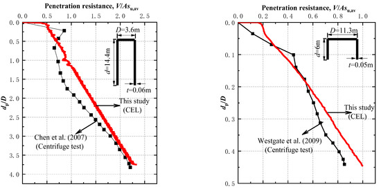 Comparison of the penetration resistance between the CEL analysis results and centrifuge test results [16,23].