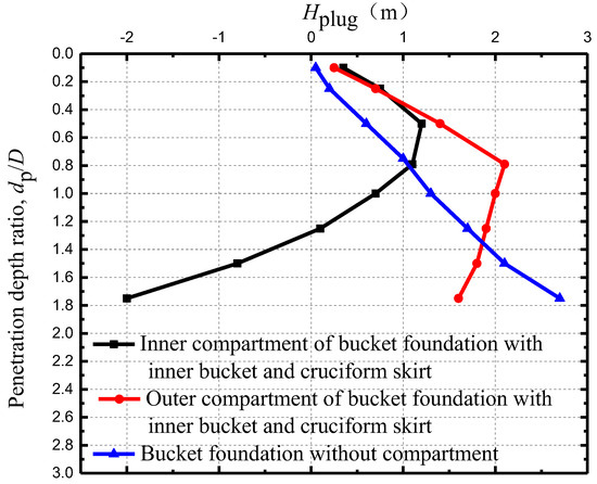It can be seen from Figure 4 that the height of the soil surface in the bucket foundation without compartment continuously increases with the penetration depth ratio. With the increase of the penetration depth ratio, the soils displaced by the skirt are inclined to flow into the bucket. This is because the earth pressure within the bucket decreases with the increase of the penetration depth ratio due to the increase of the soil strength with depth. For the foundation with inner bucket and cruciform skirts during the shallow penetration, the Hplug is significantly higher than that of the bucket foundation without compartment. This is due to the added inner bucket and cruciform skirts squeezed more soil during the penetration, which gradually flowed into the inner or outer compartment. As the penetration depth ratio increases (i.e., dp/D > 0.5 for the inner compartment and dp/D > 0.8 for the outer compartment), the Hplug decreases with the increase of the penetration depth ratio. The main reason lies in the larger friction resistance caused by the inner bucket and cruciform skirt, which prevents the soil from flowing into the inner or outer compartment.