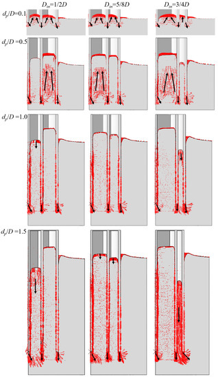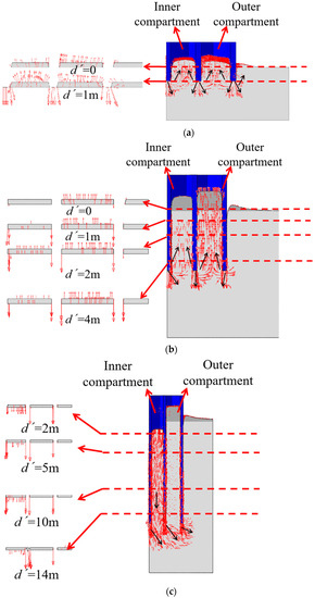 The evolution of the soil surface height in each compartment has correlation with the soil flow. Figure 5 is the section view of the soil flow velocity vector at different positions and penetration depths (i.e., the section view is the soil flow along the section 1-1’ in Figure 2b). Figure 5a reflects the trend of soil flow during shallow penetration (d/D = 0.1). It can be seen that the soil around each skirt flows downwards and then evenly flows to both sides. As the penetration depth increases to d/D = 0.5 in Figure 5b, and since the outer boundary of the bucket is closer to the semi-infinite space and the inner boundary of the bucket is limited, the passive earth pressure inside the bucket is lower than that of the outside. The soil is more inclined to flow in the compartment. When the penetration depth further increases to d/D = 1.5 in Figure 5c, the contact area between the skirt and the soil also increases. The influence of side friction during the penetration of the foundation cannot be ignored. The larger frictional resistance in the inner and outer compartments not only hinders the upward flow of the soil (such as that in the outer compartment), but also pushes a large amount of soil to move downward together (such as that in the inner compartment).