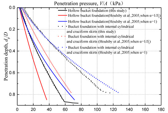 where V′ is the total penetration resistance of the foundation; Di and D′ are the internal diameter of the bucket and the average diameter of the bucket; hence, πD′t is approximately equal to the area of the foundation bottom; d is the penetration depth; α0 and αi are the adhesion coefficients of the frictional resistance on the outer skin and inner skin of the bucket, respectively; su0,av is the soil average intact undrained shear strength over the penetration depth, while su0,tip is the soil intact undrained shear strength at the skirt tip level; and Nc is the end bearing capacity coefficient of the deep strip foundation in the clay [25]. For undrained soft soil, Nq = 1. The predicted results obtained from the equation proposed by Houlsby and Byrne [24] are shown in Figure 6. The results obtained from the formula proposed by Houlsby and Byrne [24] when α0 =αi = 1/St are smaller than the CEL results, which is mainly because the soil is considered as the fully-remolded soil after the penetration of the bucket foundation. When no strain softening is considered for the soil, i.e., when α0 =αi = 1, the results calculated by the equation proposed by Houlsby and Byrne [24] are larger than the finite element results in this study. However, a portion of soils should be considered as in a partially-remolded condition. Therefore, the penetration resistance of the bucket foundation in clay accounting for a partially-remolded condition in this study is more reasonable.