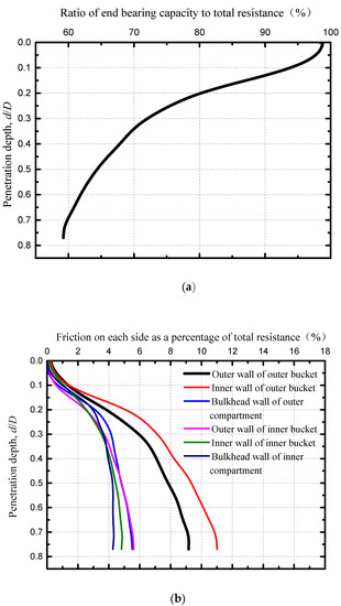 Although the bucket foundation studied in this paper incorporates the inner bucket and cruciform skirts, its penetration resistance can still be calculated according to the theory proposed by Houlsby and Byrne [24]. The ratio of the individual resistance to the total resistance of the bucket foundation with the inner bucket and cruciform skirts is shown in Figure 7.