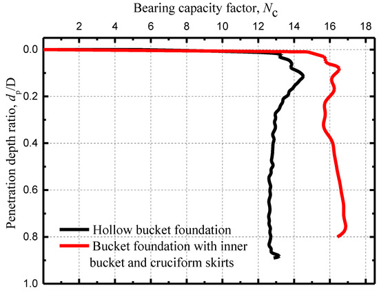 It can be seen from Figure 8 that the end bearing capacity coefficient of the hollow bucket foundation first increases with the penetration depth and then slightly decreases before stabilizing during further penetration. For bucket foundations with inner bucket and cruciform skirts, after the end bearing capacity coefficient increases and then slightly decreases with penetration depth, a slight increase occurs with penetration depth. For the investigated penetration depth, the end bearing capacity coefficient of the bucket foundation with inner bucket and cruciform skirts is obviously greater than that of the hollow bucket foundation.