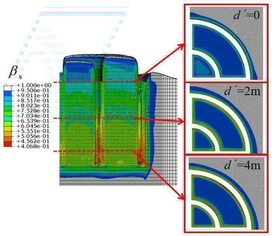 Taking the penetration depth ratio d/D = 0.5 as an example, the section view of the softening factor of the soil is shown in Figure 9. The corresponding softening factor of the soil near different skirting boards is shown in Figure 10.