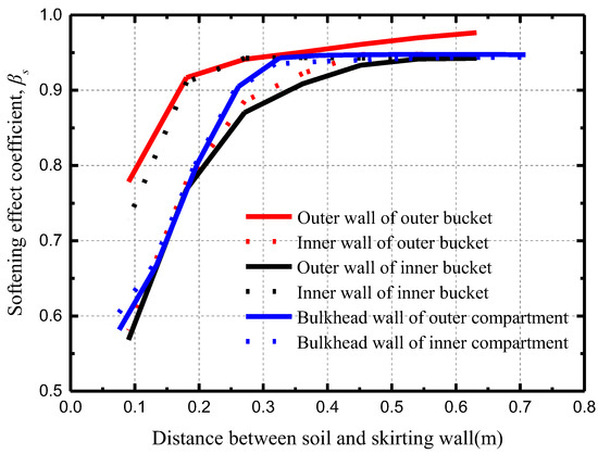 It can be seen that the deeper the depth, the more severe the softening effect. Among the different skirting walls, most softening occurred in the outer wall of the inner bucket. However, due to the larger volume of soil in the outer compartment, the cohesion coefficient for the inner wall of the inner bucket is the largest while the cohesion coefficient of the outer wall of the outer bucket is the smallest.