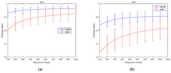 In this experiment, Gaussian white noise is used to compare the FDE and DE value changes in the sequence length. Gaussian white noise is a random signal of a power spectral density to be constant. In this section, 50 groups of Gaussian white noise with different lengths are chosen for the comparison experiments, and the length of the time series is also increased from 100 to 1000 in intervals of 100. Then, the FDE and DE values of these Gaussian white noise are calculated at scales of 2 and 5, respectively, and the rest of the parameters, including and , are all set to 3. Figure 2 shows the multiscale results of the FDE and DE of Gaussian white noise at different lengths.