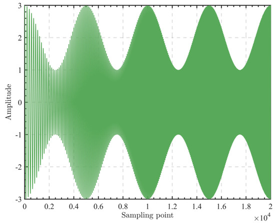 where is the chirp signal, with a frequency increasing from an initial 5 Hz to a final 30 Hz. is the carrier amplitude and is the frequency of the debugging signal. Set ,. Figure 3 shows the amplitude-modulated chirp signal domain waveform; its length is 20 s, and the sampling frequency is 1000 Hz.