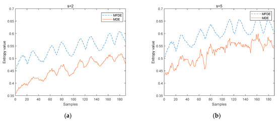 From Figure 2, we can observe that, no matter = 2 or = 5, as the length of Gaussian white noise increases, the values of both MFDE and MDE tend to be closer to 1, indicating that the longer the length of the time series, the more information can be extracted. Further, it should be noted that MFDE is closer to 1 than DE, which means that MFDE can better reflect the complexity of the signal; in addition, in terms of stability, the standard deviation of MFDE is also smaller compared with MDE, regardless of the length of the signal, which indicates that MFDE is more stable in terms of entropy value compared with MDE. In conclusion, the entropy value of FDE is more stable than that of DE at multiple scales, and it can reflect the complexity of the signal more effectively.