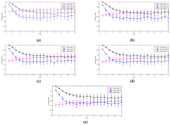 From Figure 6, it can be seen that with the increase in scale, the trend of the MFDE of each category of noise is the same as Figure 5. Further, with the increase in the number of categories, the MFDE values of each category of noise do not change much. In addition, with the same , the standard deviation of MFDE becomes gradually larger with the increase in scale. In brief, the change in the number of categories has no significant effect on MFDE, and the smaller the scale, the more stable the MFDE; thus, we suggest that the number of categories can be taken as an integer between 3 and 8.
