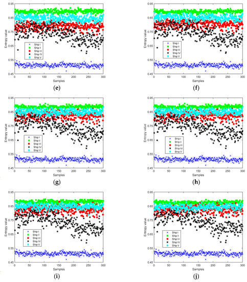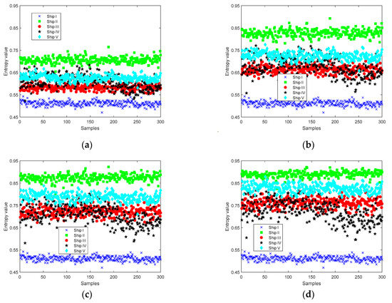 As can be seen from Figure 8, the entropy distribution of MFDE has the lowest degree of confounding at the condition of the highest recognition rate, and the interval between the entropy of various types of ships is more obvious; in the entropy distribution plots of MDE, MSE, and MPE, each type of signal has different degrees of confounding. The experimental results show that MFDE has better feature extraction than other entropies.