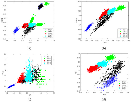 Although the recognition rate of MFDE is the highest with a single feature, it only reaches 81%, and the recognition effect is not obvious. This experiment compares the feature extraction ability and recognition rate of MFDE, MDE, MSE, and MPE for ship-radiated noise under the condition of combining double-number features, and further studies the ability of MFDE for ship-radiated noise analysis. Due to the high number of scale combinations under the double-number feature, in this experiment, only the scale combinations under the highest recognition rate are analyzed. Figure 8 shows the feature distribution of four types of entropy under the double-number feature.