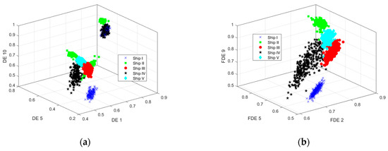 In order to further improve the classification recognition rate of ship-radiated noise and thus highlight the feature extraction effect of MFDE more intuitively, based on the double-number features, this experiment conducts a comparative experiment on triple-number feature extraction. This experiment still demonstrates the advantages of MFDE by comparing the feature extraction ability and ship-radiated noise recognition rate of MFDE with other three entropies (MDE, MSE, and MPE). Moreover, since there are more combinations of triple-number features compared to double-number, this experiment only analyzes the scale combinations at the highest recognition rate. Figure 9 shows the feature distribution of four types of entropy under triple-number features.