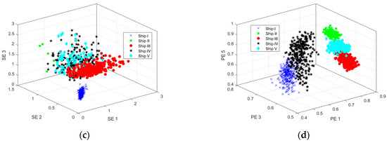 As can be seen from Figure 9, the interval between the various types of ship-radiated noise of MFDE is more obvious with the highest recognition rate, and the overlap between the signals is lower, while there are different degrees of overlap between the various types of signals of MDE, MSE, and MPE. The experimental results show that MFDE has a better feature extraction effect and stronger differentiability than the other three entropies.