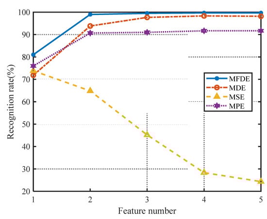 Figure 10 shows the recognition rate of three types of entropy under different numbers of features. From Figure 10, it can be seen that the entropy recognition rates of three types of MFDE, MDE, and MPE increase, and MSE decreases as the number of features increases; moreover, the recognition rate of MFDE is the highest for all numbers of features, which reflects better complementarity between features at different scales in MFDE. The results further demonstrate that MFDE performs best for the feature extraction and classification recognition of ship-radiated noise.