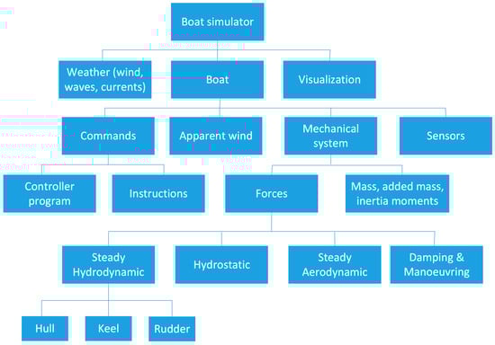 Other works that simulate autonomous sailboats include the use of ROS-Gazebo to integrate the sensors []. In comparison, in this work, an environmental model is run in real time using Simulink, and the sailboat is included as a module that reacts to the different events. The sailboat module can be implemented in software and, as will be described, using hardware-in-the-loop (HIL).