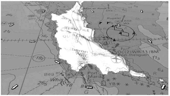 The test area chosen to assess the validity of the HIL and optimize the sailboat parameters is shown in Figure 2. The trajectory of the sailboat (black line) is represented in geographical coordinates over ground. The positions of the wind vanes are represented using the black triangles with flags in the navigation area (black circle). Three of the anemometers are located on the circle, while the fourth is in the center of the black circle delimiting the sailing area. The large white arrows represent the current direction.
