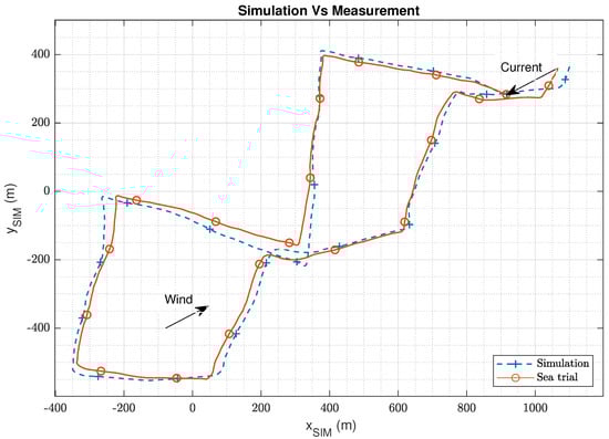 A comparison is shown in Figure 3 between the simulation and sea trials trajectory. The average wind is south–southeast at 150°, indicating that it is from the bottom left corner in Figure 3 with an angle of 30° with axis. Contrary to Figure 2, the last point of the sea test trajectory does not meet the starting point. This is due to the current, consistent with Figure 2. To make a fair comparison, the pilot of the simulator is trimmed to the apparent wind recorded onto the real sailboat. The distance between the final point and the starting point shows how the water surface drifted with the ground during the 1823 seconds of the test. The comparison between the two curves shows good agreement between the trials and simulation. A slight difference appears in the middle of the second tack, which corresponds to a change in the jib roller trim on the real boat. The advance taken by the simulated sailboat on the real one is kept until the upwind mark. This advantage increases further downwind. This may be due to the perfection of the simulated maneuver. As an example, the spinnaker is instantaneously set up once 80° in the apparent wind is crossed.