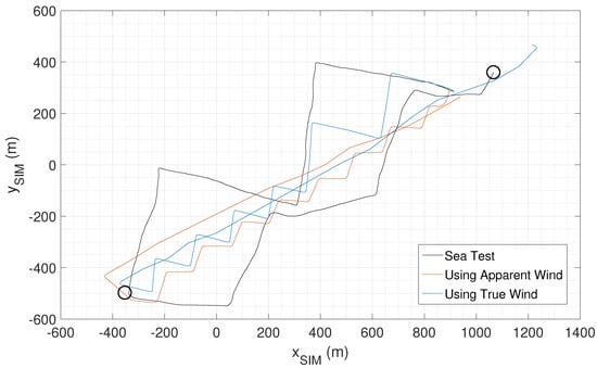As illustrated in Figure 5, the utilization of true wind results in a significant improvement in performance. Specifically, when using apparent wind, the simulated boat is unable to reach the second waypoint within 1823.0 s. However, when using true wind, the boat simulation successfully validates the second waypoint and proceeds beyond it, which suggests that it reaches the waypoint well before 1823.0 s. Using this result, the following simulations are implemented using true wind.