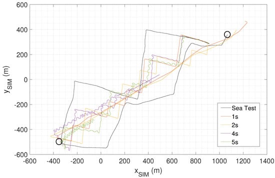Simulated trajectories for various heading refresh rates in comparison to sea test trajectory.