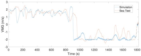 VMG i.e., projection of velocity onto true wind for simulated and sea test results.