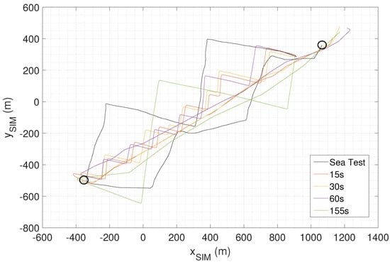 Simulated trajectories for various course refresh rates in comparison to sea test results.