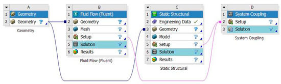 Figure 2 shows the route of the fluid–structure coupling technique, calculating the wind turbine blade surface pressure in the fluid domain and the structural deformation in the solid domain, as well as the data interaction between the different software of ANSYS. The fluid–structure coupling simulation system in this paper is built in the ANSYS workbench. In two-way fluid–structure coupling, the CFD module FLUENT and the CSD module mechanical APDL connect and exchange data through the system coupling module. The bidirectional coupled system is shown in Figure 3.