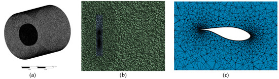 Considering the irregular shape of the wind turbine blade surface, the unstructured mesh can well adapt to the creation of an irregular surface mesh, and the mesh shape fits the solid surface; thus, the unstructured tetrahedral mesh is used to divide the shunt field grid. The basic size of the grid in the static domain is 4 m, the basic size of the grid in the rotating domain is 2 m, the maximum mesh size on the blade surface is 0.2 m, the minimum mesh size is 0.04 m, the thickness of the first boundary layer is 0.01 mm, there are 15 layers in total, and the total mesh size is 6.23 million. The grid division diagram is shown in Figure 5.