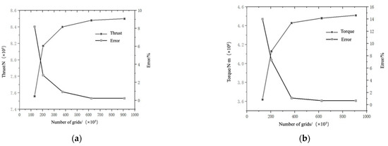 Grid convergence verification: (a) thrust; (b) torque.