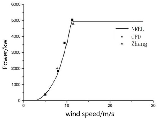 Figure 7 shows the comparison between the CFD simulation value in this paper, the NREL design value and the power value obtained by Yang (2020) [33] using the numerical simulation method under different working conditions. It can be seen from Figure 3 that a good degree of agreement is maintained. Once again, the correctness of the model used in the simulation is verified.
