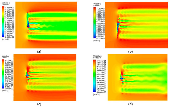 Velocity distribution of flow field under different incoming flow velocities: (a) 5 m/s; (b) 10 m/s (c) 8 m/s; (d) 11.4 m/s.