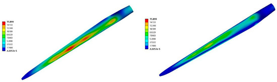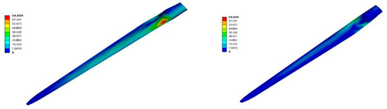 In order to better study the stress distribution law of wind turbine blades, the equivalent stress distribution of a single blade was intercepted, as shown in Figure 15.