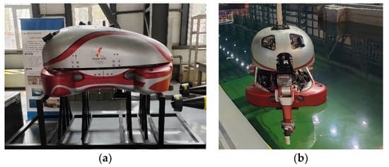 The performance of the proposed control scheme was verified using the variable structure robot (VSR) platform. The VSR is a new kind of UVMS that can switch from AUV mode (Figure 1a) to ROV mode (Figure 1b) by lifting the upper hull and spreading the manipulator outside the streamlined hull. The VSR is equipped with an electric seven-DOF manipulator (including a grasper). In addition, the VSR is actuated by eight thrusters; such a mechanism provides the vehicle with six-DOF control ability. In other words, the VSR can individually perform control surge, sway, heave, roll, pitch, and yaw motions.