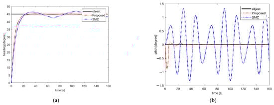 To verify the attitude control effectiveness of the proposed scheme, the vehicle was guided to rotate from heading 0 degrees to 90 degrees. To simulate the manipulator disturbance, the end twist joint of the manipulator was set to follow an angle curve of 2×sin (0.4t). Figure 2 shows the attitude control results of the vehicle in station keeping mode between the proposed scheme and SMC. Figure 2a shows the heading control results for the vehicle. The heading control response of the SMC was quicker than the response of the proposed scheme. However, the heading control stability of the proposed scheme was much better than that of the SMC under time-varying disturbance. Figure 2b shows the pitch control results for the vehicle. Compared with the control of the horizon plane, the control of the vertical plane was more sensitive to disturbance due to manipulator motion. In Figure 2b, it can be seen that the pitch control of the proposed scheme attenuated time-varying disturbance more promptly and achieved better stability than that of SMC. Once the proposed scheme compensated the disturbance in the vertical plane, the nominal performance of the proposed scheme was recovered. Hence, the attitude control effectiveness of the proposed scheme was higher than that of SMC, especially under time-varying disturbance from manipulator motion.