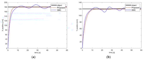 To verify the trajectory tracking performance of the proposed scheme, the end effector was guided from [0,0,0] to [180,120,0] in the task space. Figure 3 shows the trajectory results for the end effector between the proposed scheme and SMC. Figure 3a,b show the end effector position in X-direction and Y-direction, respectively. The position curves in Figure 3 are divided into two stages. The motion of the end effector was determined by the rotation of manipulator joints and the displacement of the vehicle. In the first stage of Figure 3, the speed of the trajectory was mainly determined by vehicle displacement because the objective position was far beyond the reachable space of the manipulator. The trajectory speeds of SMC and the proposed scheme were very close. However, the trajectory of the proposed scheme was smoother than that of SMC when the position was closed to the objective position. In the second stage of Figure 3, the speed of trajectory was mainly determined by the rotation of the manipulator joints when the position error was less than 20 cm. In other words, the trajectory control encounters more complex interactive forces between the vehicle and the manipulator. From the position error curves in the Figure 3a,b, the trajectory of the proposed scheme was smoother than that of SMC, and the proposed scheme could asymptotically converge to zero even under time-varying disturbance. Therefore, the trajectory control performance of the proposed scheme was also verified, even under the complex disturbance of interactive forces between the vehicle and the manipulator.