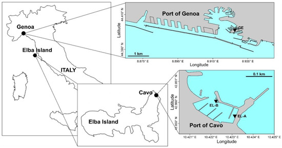 Study areas (Italy): the Port of Genoa (on top) and the Port of Cavo (on bottom). The inverted triangles represent myco-barrier deployment sites (GE in the Port of Genoa and EL-A and EL-B in the Port of Cavo).