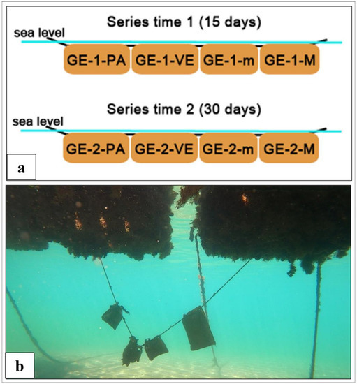 Barriers’ setup: (a) Scheme of the composition of the barrier series: GE represents the site in the Port of Genoa; 1 and 2 are the two recovering times at 15 and 30 days, respectively; PA is the original barriers; VE is the vegetal barriers; and “m” and “M” are the barriers consisting of micro- and macrofungi, respectively. (The series installed in the Port of Cavo had the same structure with the EL-A and EL-B for the site identification.); (b) image of a barrier series in the Port of Cavo.