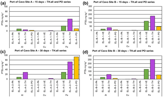 Results on bioaccumulation of PTEs in myco-barriers, compared to original barriers (PA) and vegetal barriers (VE), from the Port of Cavo (EL): (a) T. harzianum (TH.all) and P. ostreatus (PO) in site A after 15 days (EL−A−1−TH and EL−A−1−PO); (b) TH.all and PO in site B after 15 days (EL−B−1−TH and EL−B−1−PO); (c) TH.all and PO in site A after 30 days (EL−A−2−TH and EL−A−2−PO); and (d) TH.all and PO in site B after 30 days (EL−B−2−TH and EL−B−2−PO).
