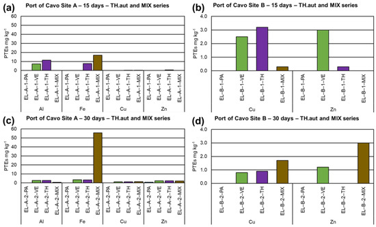 Results on bioaccumulation of PTEs in myco-barriers, compared to original barriers (PA) and vegetal barriers (VE), from the Port of Cavo (EL): (a) T. harzianum Rifai group (TH.aut) and Simplicillium with Trichoderma genera (MIX) in site A after 15 days (EL−A−1−TH and EL−A−1−MIX); (b) TH.aut and MIX in site B after 15 days (EL−B−1−TH and EL−B−1−MIX); (c) TH.aut and MIX in site A after 30 days (EL−A−2−TH and EL−A−2−MIX); and (d) TH.aut and MIX in site B after 30 days (EL−B−2−TH and EL−B−2−MIX).