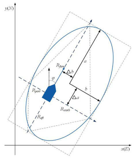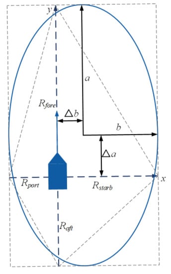 where and are the long and short axes, respectively; is the offset of the ship from the center of the ellipse to the stern along the long axis; and is the offset of the ship along the short axis. These parameters can be calculated from the four radii of the quaternion ship domain []: