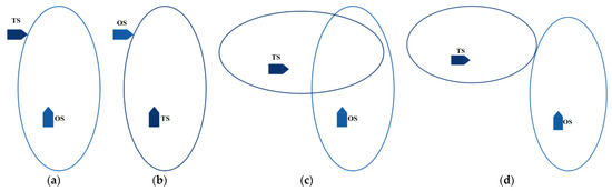 - The TS is outside the ship domain: the TS is leaving the OS domain (Figure 6(6)), so .