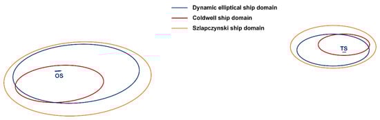 These four criteria were proposed to accommodate the different types of ship domains, which can have large differences. The size and shape of the ship domain greatly affect the effective safe distance between ships. Criteria 1 and 2 may be considered asymmetric: even if the same type of ship domain is used, they may lead to different safety assessments depending on which ship (i.e., OS or TS) is considered. Criteria 3 and 4 may be considered symmetric: as long as the same type of ship domain is applied, the safety assessment of the encounter will be the same, regardless of which ship is considered. In open waters, the collision between two ships will result in greater loss for smaller ships. Thus, we adopted criteria 1 and 2 for the dynamic elliptical ship domain with a center offset to fully consider the responsibilities of the two ships for collision avoidance. We decided against adopting criteria 3 and 4 to avoid the excessive pursuit of nonoverlapping ship domains, which would lead to early decision-making and excessive collision avoidance actions.