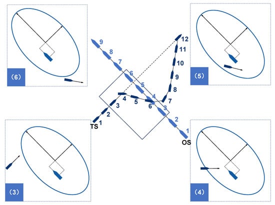 Consider a TS sailing in open waters that encounters an OS in a crossing situation, as shown in Figure 6. The TS adheres to the collision avoidance principle of early action and large-scale steering. The TS sails from the initial position (marked as 1) to the point where it initiates the avoidance action (4). It then turns right and sails to the point of re-navigation (6). After the OS passes by completely, the TS turns back toward the preplanned route (7) and then resumes its original trajectory (12).
