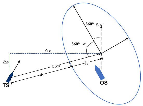 In Figure 7, the course and coordinates of the OS are represented by and , respectively, and the coordinates of the TS are given by . Then, the coordinates for the center of the OS domain can be calculated as follows: