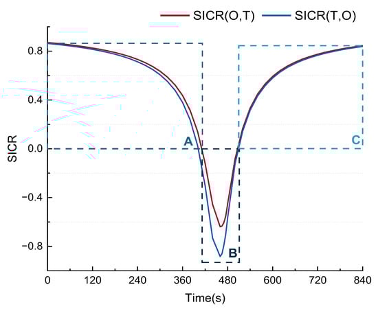 To demonstrate the feasibility of the proposed SICR, the SICR values for a TS intruding into the OS domain and an OS intruding into the TS domain in a head-on encounter situation were calculated. The SICR allows for a more intuitive measure of the relative collision risk between the two ships. Figure 8 shows a schematic diagram of the changes in SICR values for the two ships in Table 2, which were calculated using the initial time information in Table 3. In the head-on encounter situation, both ships maintained their speed and course, and no collision occurred. The red solid line represents the SICR (O, T) (i.e., the TS enters the OS domain). The encounter can be divided into three stages: the TS (A) approaches, (B) enters, and finally (C) exits the OS domain. In stage A, the two ships are approaching each other, but the TS is not inside the OS domain. The SICR decreases with decreasing distance between the two ships. In stage B, the TS enters the OS domain (SICR = 0). As the TS intrudes further into the OS domain, the SICR gradually decreases until it reaches the minimum value. When the SICR begins to increase, this indicates that the TS is leaving the OS domain. In stage C, the TS sails out of the OS domain (SICR = 0). The SICR continues to increase with increasing distance between the two ships.