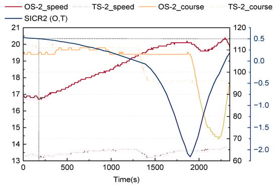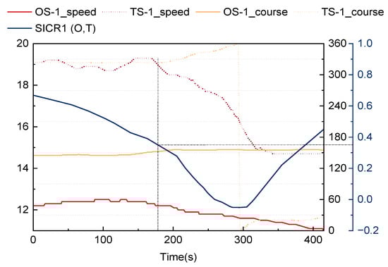 Figure 10 shows that the collision avoidance actions of TS-1 resulted in relatively gentle changes in DCPA. This may cause difficulties with obtaining an early warning and may delay collision avoidance actions. The duration of the TS-1 intrusion into the OS-1 domain was short at 56 s, which is consistent with the characteristics of the encounter situation: a fast relative speed and short time for judging and avoiding collision. The timing of the action taken by TS-1 was consistent with the obtained values of the proposed SICR model.