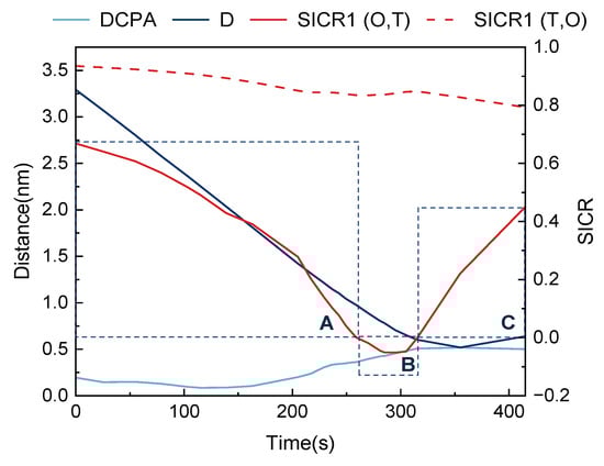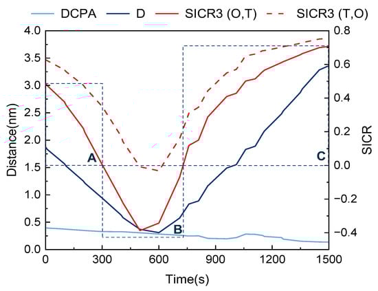 According to COLREGs, when two ships are at a collision risk in a head-on situation, they should turn to the right and pass each other on the port side. Figure 9 shows the actual head-on encounter situation between two ships based on their AIS data. The initial conditions are presented in Table 4. Figure 10 shows the variations in DCPA, D (i.e., the distance between the two ships), and the SICR. The red solid line segment represents the SICR1 (O, T) of TS-1 intruding into the OS-1 domain, and the red dotted line shows the SICR1 (T, O) of OS-1 intruding into the TS-1 domain. The SICR1 (O, T) is smaller than the SICR1 (O, T), so it was used to evaluate the collision risk in this scenario. The SICR1 (O, T) shows that the head-on encounter situation process can be divided into stages A, B, and C (shown as rectangles).