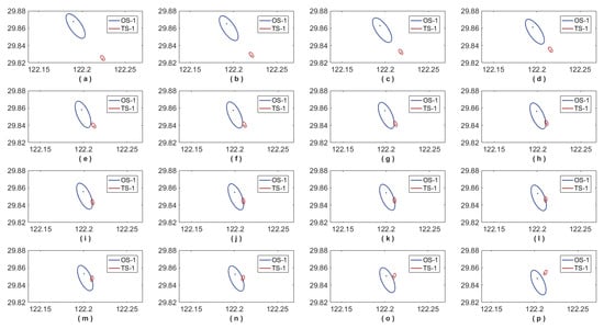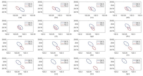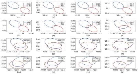 Figure 11 shows the changes in the relative positions of the two ships and their domains as well as the corresponding SICR1 (O, T) values for the head-on encounter situation as 16 subgraphs. In stages A (subgraphs a–i) and C (subgraphs o–p), TS-1 did not invade the domain of OS-1. In stage B (subgraphs j–n), TS-1 gradually invaded the domain of OS-1. In stage A, as the distance between the two ships gradually decreased, the SICR1 (O, T) gradually decreased from 0.669 to 0, at which point TS-1 invaded the ship domain of OS-1 (i.e., stage B). TS-1 then began to decelerate and turn to the right to avoid collision (subgraph f) when t = 163 s and the SICR1 (O, T) = 0.391. As the two ships came closer, TS-1 intruded further into the OS-1 domain. However, the collision avoidance actions of TS-1 slowed the decrease in the SICR1 (O, T) until the minimum value of SICR1 (O, T) = −0.051 was reached. TS-1 took action to leave the OS-1 domain (subgraph j), and the distance from OS-1 gradually increased with the SICR. In stage C, TS-1 continued to sail away from OS-1 until it was no longer in the OS-1 domain, and the SICR1 (O, T) gradually approached 1 as the distance between the two ships increased. The greatest intrusion of TS-1 into the OS-1 domain corresponded to the highest risk of collision.