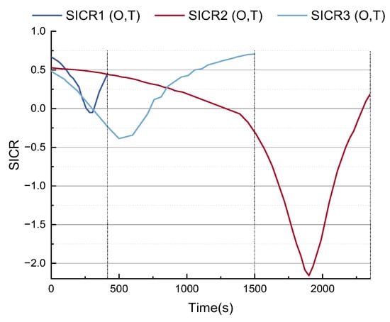 Figure 16 shows that TS-3 taking collision avoidance actions resulted in relatively gentle changes to DCPA. Thus, it would be difficult to use DCPA to obtain an early warning in this situation, which can lead to delayed collision avoidance actions. The intrusion of TS-3 into the OS-3 domain lasted 426 s, which is between the durations for the head-on and overtaking scenarios. This is consistent with the characteristics of the crossing encounter situation. The collision avoidance actions taken by OS-3 corresponded with the values obtained by the proposed SICR model.