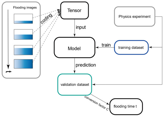 The process sketch of the complete flooding time prediction is shown in Figure 1. In Figure 1, the input of the composite neural network is the flooding images provided by the physical experiment. The final output of the composite neural network is the tf of the target compartments.