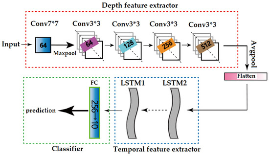 A composite neural network based on CNN–RNN is used in this paper. Flooding images are obtained from flooding video clips. The CNN part extracts the spatial information of images and outputs a tensor. Then, this tensor is input into the RNN part, and the temporal features are extracted in the RNN part. Its structure is shown in Figure 3.