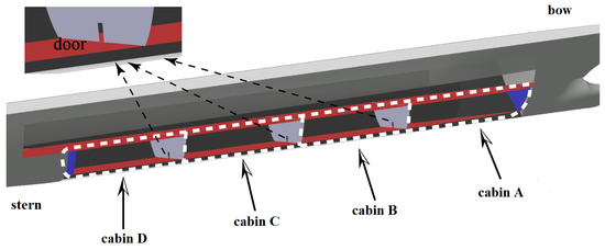 In fact, the goal of evacuation decision-making should point to a larger area. Individual compartments that are very close to the opening will be flooded soon after the ship is damaged. There is insufficient meaning for individual compartment’s decisions. Therefore, the flooding area selected in this paper occupies more than 80% of the entire deck space. The four compartments are separated by watertight arrangements. There is only one open watertight door between them. The engine room was chosen because there are usually many crews. These crews all need decision-making information to determine whether to continue anti-sinking operations and when to evacuate.